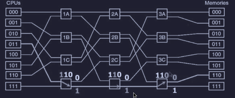 Per capire il funzionamento di una rete omega, supponiamo che la CPU numero 3 (011) voglia leggere una parola dalla memoria 6 (110), quindi la sequenza sarà la seguente mostrata con le frecce :