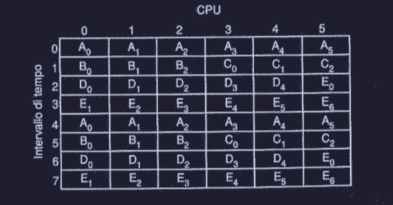 - ai membri della gang viene dato un intervallo di tempo per l’utilizzo delle CPU (come nel timesharing) ma con la regola del “tutti o niente” (space sharing)