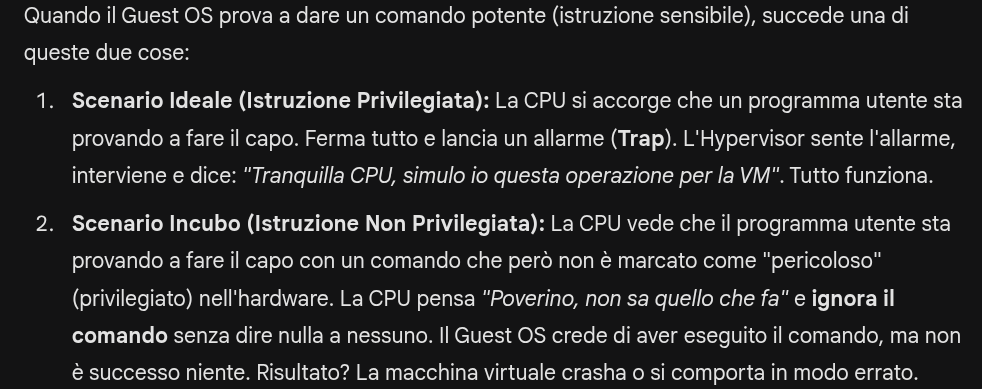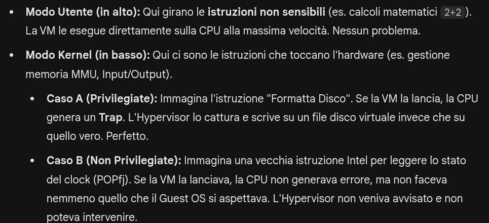 l Sistema Operativo della VM (Guest OS) crede di essere il “padrone” dell’hardware (Kernel Mode), ma in realtà gira come un normale programma (User Mode) sotto il controllo dell’Hypervisor. Inoltre ogni CPU possiede il proprio set di istruzioni.