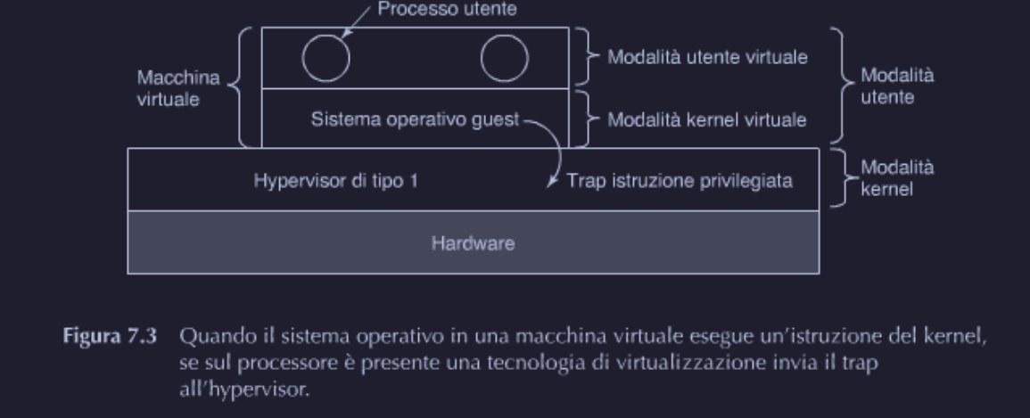 Nel hypervisor di tipo 1 la macchina virtuale è eseguita come un processo utente in modalità utente, quindi non può eseguire istruzioni sensibili anche se pensa si essere in modalità kernel (modalità virtuale del kernel).
