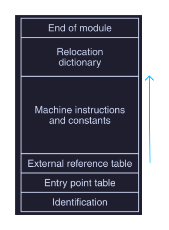 - identificativo : contiene il nome del modulo e informazioni utili al linker ( lunghezze delle singole parti del modulo )