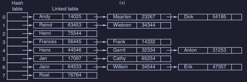- ogni posizione della tabella hash punta ad una linked list ( lista concatenata )