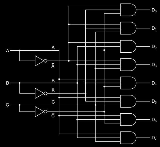 Un decoder ha input e output. Il numero in binario formato dagli -bit, “seleziona” (setta a ) uno dei input.