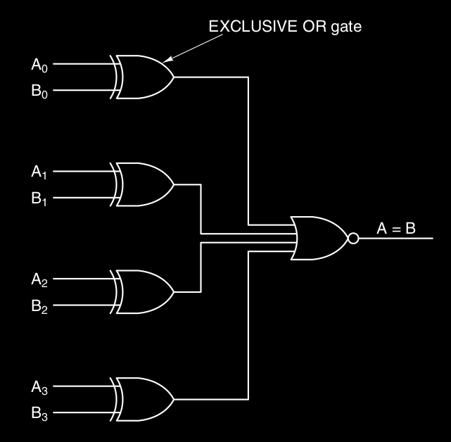 questo circuito comparatore infatti prende due word da 4 bit e mette a XOR ogni 2 bit, e con . Viene utilizzata la porta XOR, infatti la porta XOR da in output se sono diversi gli input e se sono uguali, quindi se mettiamo in XOR ogni bit di con , ognuno deve restituire se sono uguali, quindi poi basta metterli in NOR, infatti se tutti sono il NOR restituisce , se almeno uno è il NOR restituisce .