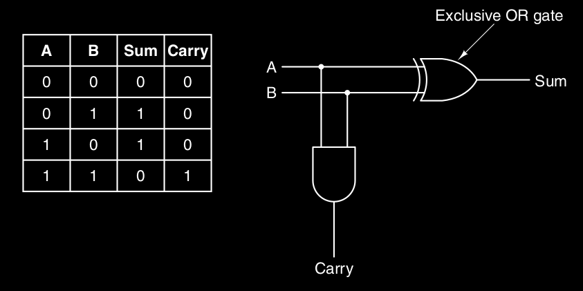 Un primo “prototipo” è un “mezzo-sommatore” ( perché non gestisce il riporto in entrata ) che prende in input due bit e , e ritorna la somma e l’eventuale riporto :