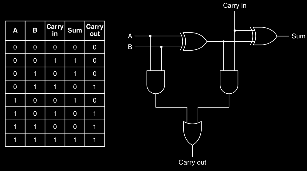 Il full-adder è un circuito sommatore composto da due half-adder è fa la somma tra 3 bit dove è un eventuale riporto in input, restituisce quindi in output la somma e un eventuale riporto in output :