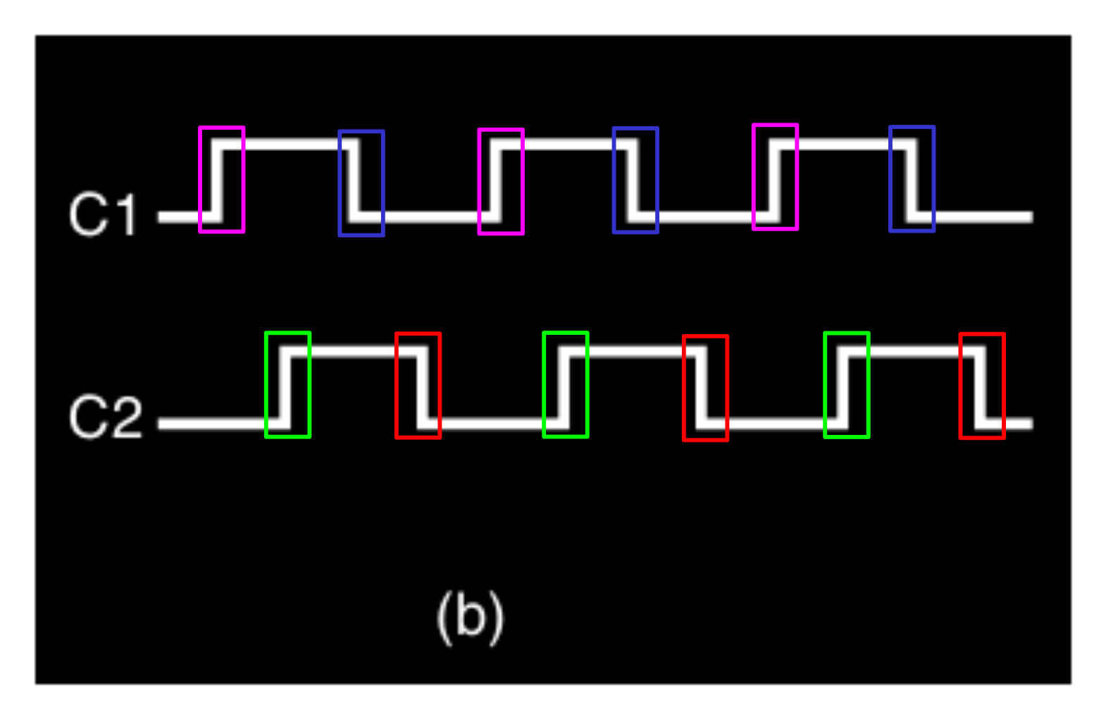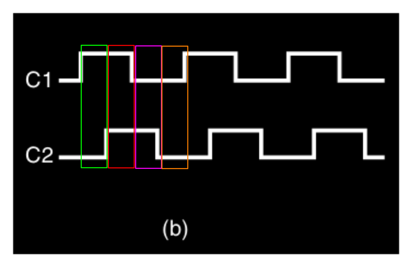 Se abbiamo bisogno di più di due diversi intervalli, possiamo fare in modo che quando i segnali dei due clock ( C1,C2 ) sono alti, si sovrappongono (in AND) in modo da avere 4 diversi intervalli :