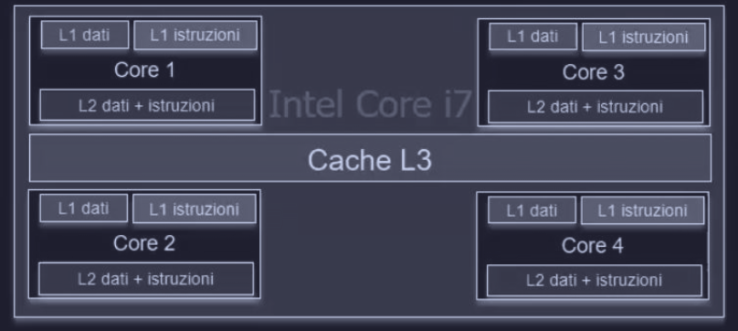 - CPU ha due cache L1 dove ci sono ( maggiormente utilizzati )