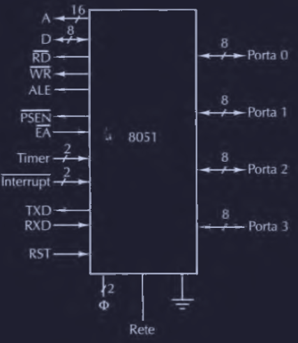 Timer: per collegare 2 timer esterni ( es. sensore ) ( 2 clock )Interrupt: consentono di interrompere la CPUTXD,RXD: per collegamento seriale I/O verso un terminale o un modem ( uscita TXD e ingresso seriale RXD )RST: reset CPU- 4 porte : ognuna bidirezionale ( può essere scritta e letta dal programma ) ed è la principale interazione con il mondo esterno