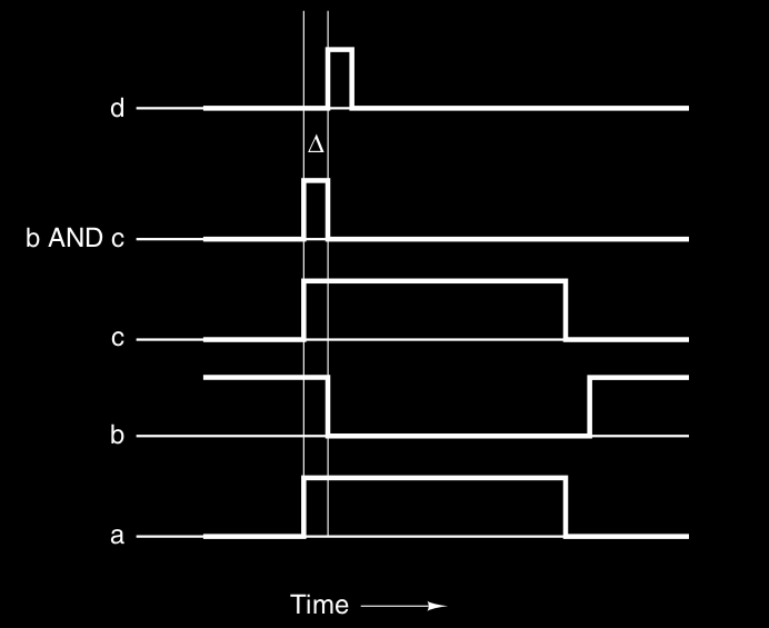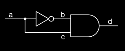 infatti quando il segnale di b e c sono messi in AND, il risultato è un impulso brevissimo, dove la larghezza di questo impulso è uguale al ritardo dell’inverter. Quindi l’output della porta AND d, è questo impulso brevissimo “shiftato” dal ritardo della stessa porta AND.