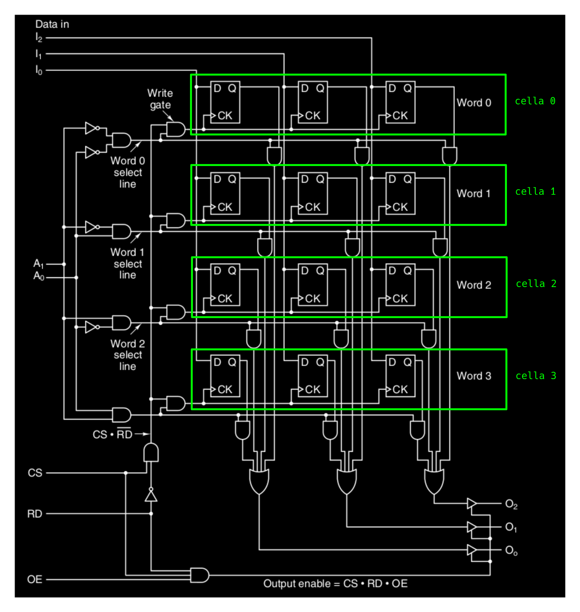 Ora è molto comodo costruire “efficientemente” una memoria più grande di quella che abbiamo visto prima da che memorizzava bit per cella. Per creare per esempio una da , basta aggiungere ad ogni cella 4 flip-flop.