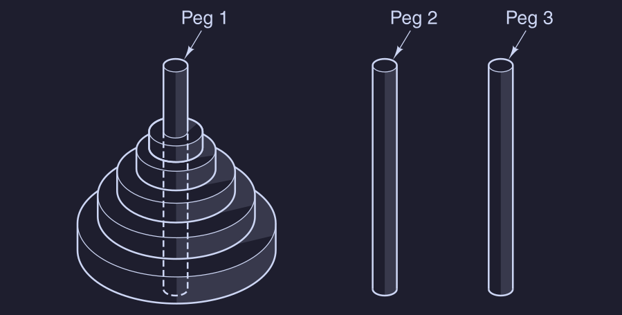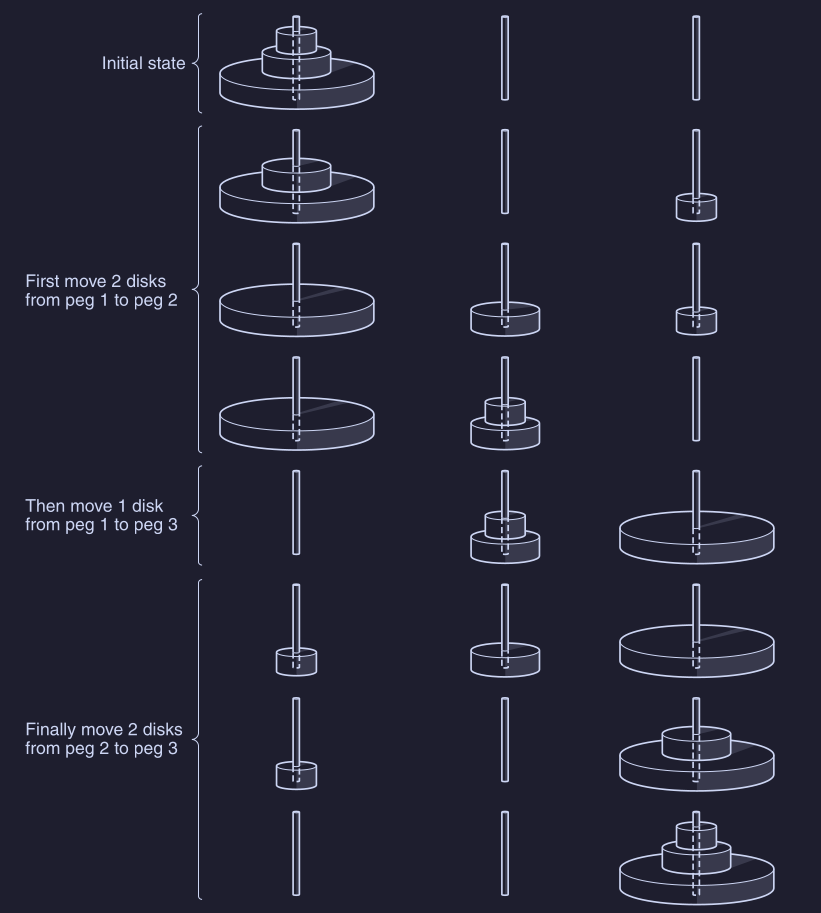 dove il problema sta nel trasferire gli dischi ( uno alla volta ) dal primo piolo al terzo, senza inserire un disco sopra uno più grande. Una soluzione sta nel muovere dischi dal piolo 1 al piolo 2, in modo da mettere l’ultimo disco più grande nel piolo 3, e poi muovere dischi dal piolo 2 al piolo 3 ( figura con 3 dischi ):