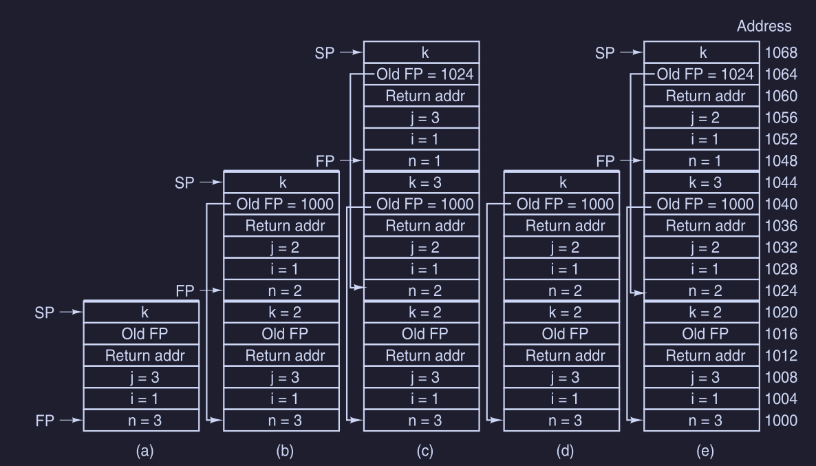 Ogni volta che una procedura viene chiamata viene allocato uno stack frame in cima allo stack per la procedura stessa. Quindi inoltre al SP ( stack pointer ) risulta conveniente avere un puntatore anche allo stack frame, FP ( frame pointer ) per poter accedere a variabili locali o parametri.