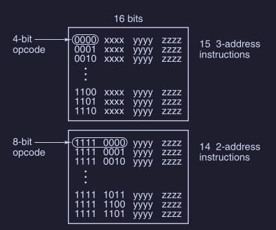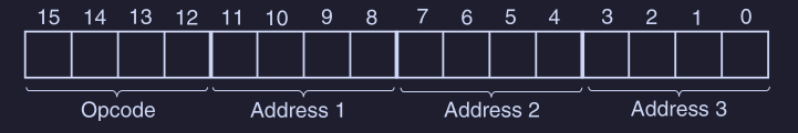- utilizzo i primi 4 bit per l’opcode ( in modo da avere 15 istruzioni , 0000-1110 ovvero da 0 a 14 ) e il resto di 12 bit li spezzo in 3 da 4 bit per gli indirizzi
