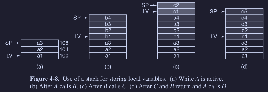 Ogni variabile è “puntata” da LV, ovvero un registro che punta alla base delle variabili locali per la procedura corrente. Mentre un altro registro SP punta alla variabile che si trova nella locazione più alta dell’intero stack.