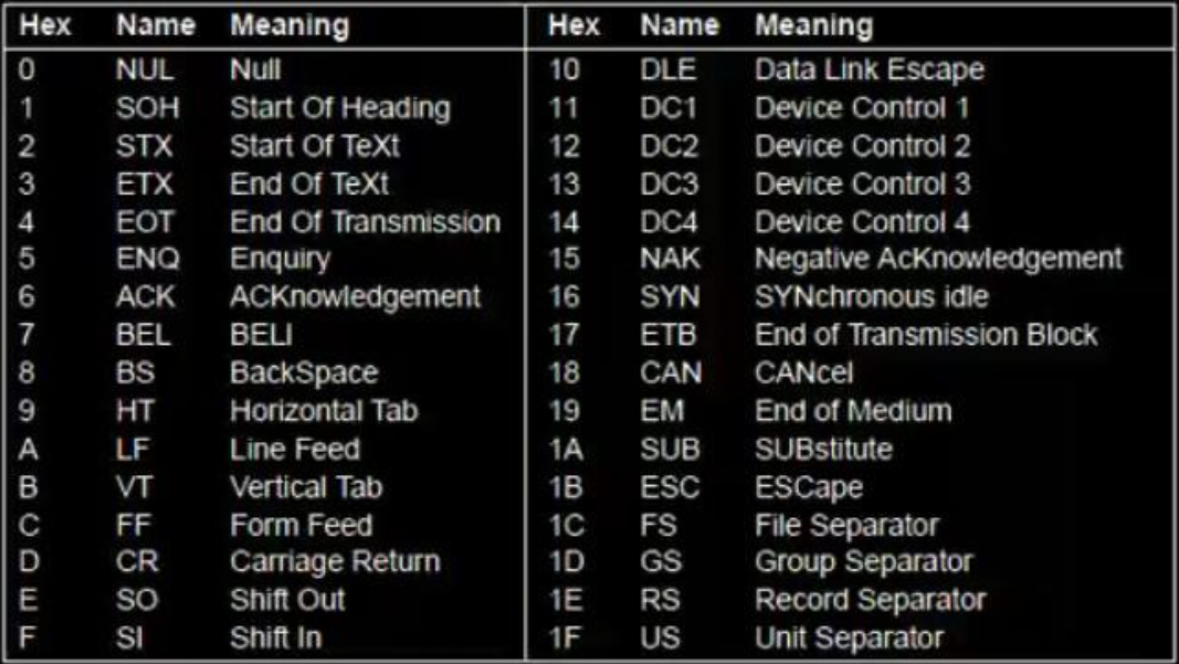 I codici iniziali che vanno da 0 a 1F sono caratteri di controllo e non sono stampabili :