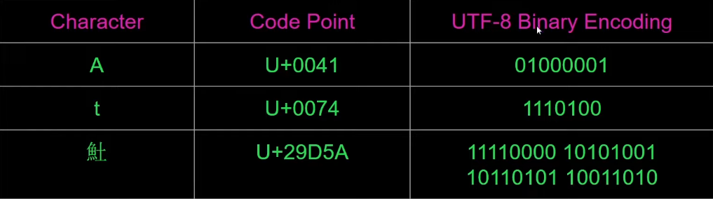 Ok come facciamo a rappresentare un code point in binario? Sono stati sviluppati vari modi ma il più utilizzato è lo standard UTF-8 ( Universal Character Set Transformation Format ) che può codificare 2 miliardi di caratteri. UTF-8 è un sistema a lunghezza variabile per i caratteri UNICODE, ovvero che non tutti i caratteri utilizzano lo stesso numero di byte